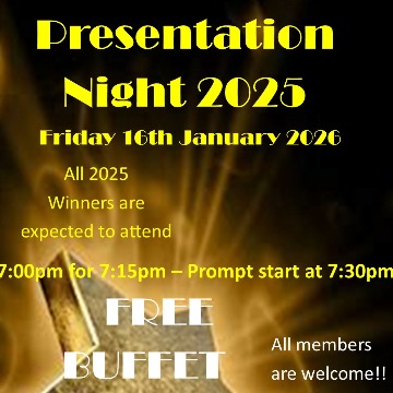 All Members, This year’s Presentation Night is taking place on Friday 16th January, 7:00pm for 7:15pm, so please put this date in your diary !!!! Competition winners are expected to attend and collect your Trophy, Replica and/or Prize from the Club Captain, but all Members are welcome. Dress code for Gentleman and Male Juniors is Collar & Tie. Dress code for Ladies and Female Juniors is Smart/Casual. There will be a free buffet, and our professional photographer Robert Wong will be attending to take your photos as usual. We look forward to your company at what is always the highlight of our Competition year.